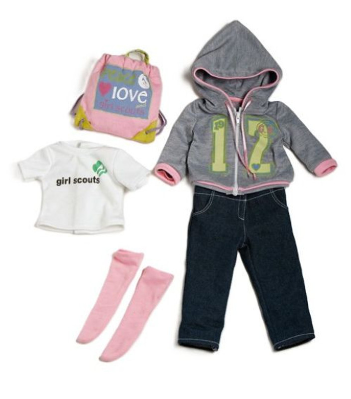 Your doll will love being in her Girl Scout outfit. The T-Shirt says "Girl Scots", the jacket has 19 Twelve, which is the year the Girl Scouts was founded. The backpack has "I Love Girl Scouts"