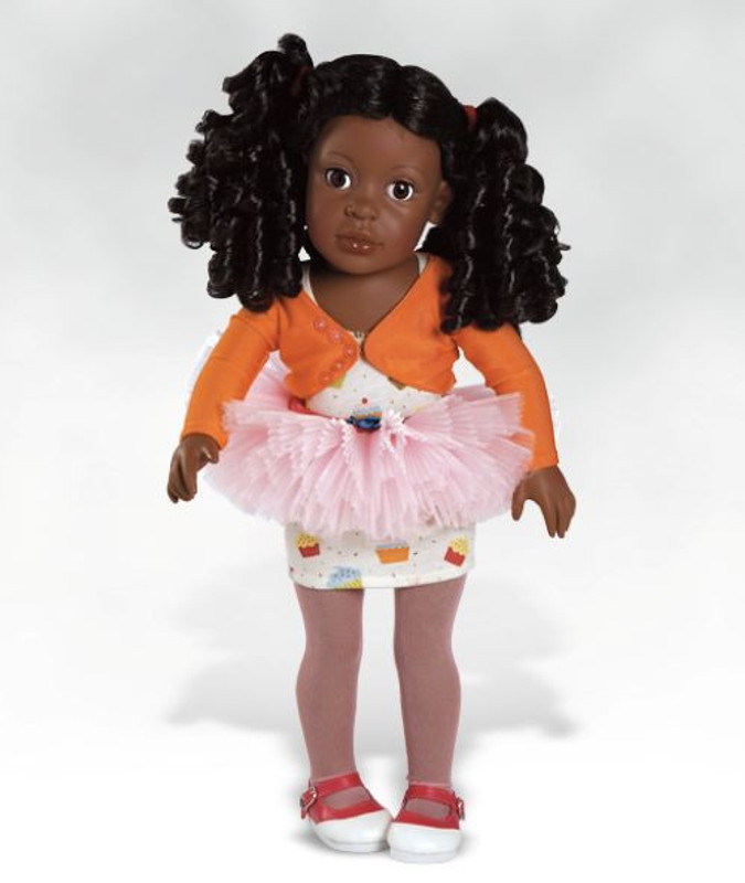 This Adora Madison 18" play friends black doll is Ready For Fun in a ice cream print dress with a pink tutu skirt an an orange bolero sweater. She has full curly pigtails.