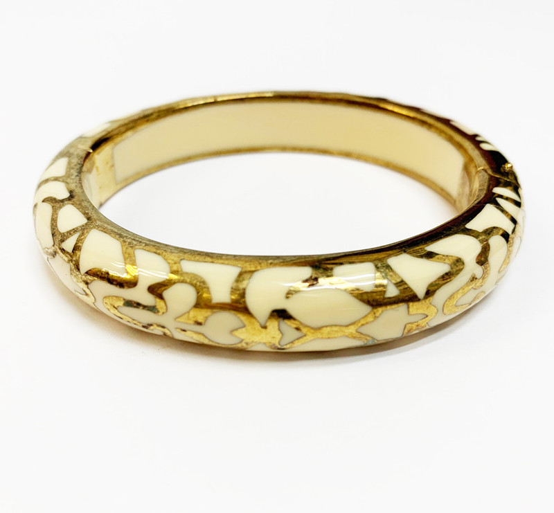 Add elegance to you life with this beautiful bangle with an affair pattern scroll in 14 kt plated gold around the bangle.