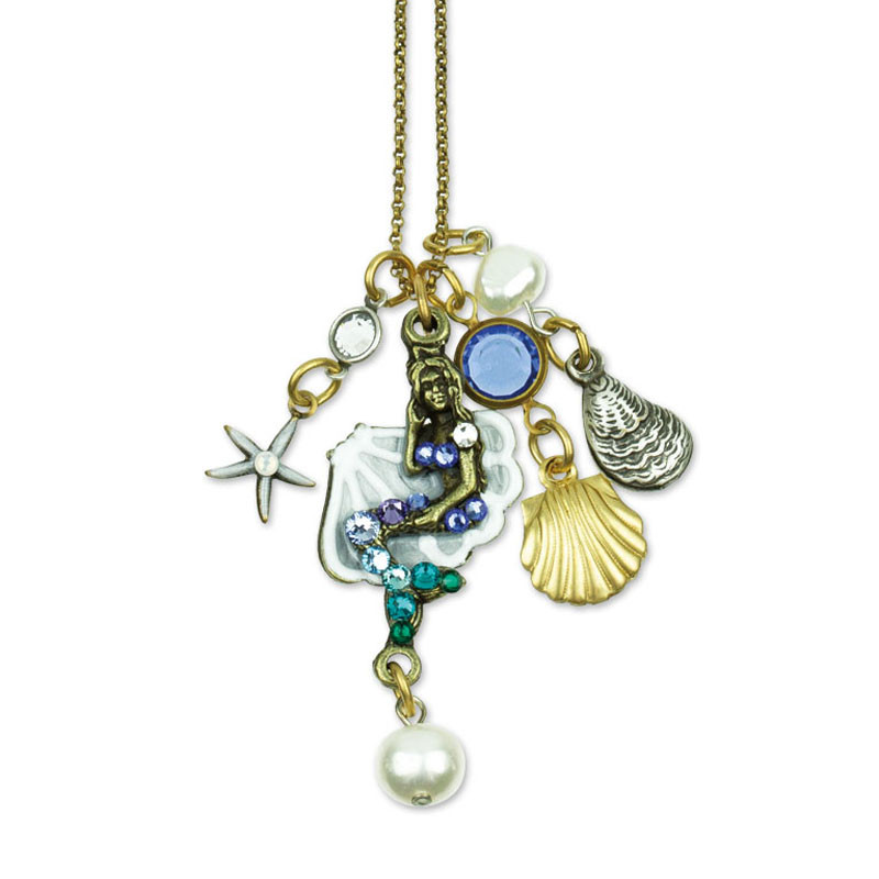 The Anne Koplik Mermaid Necklace has a charms of sea shells, oyster shell, starfish, and a dangle pearl.