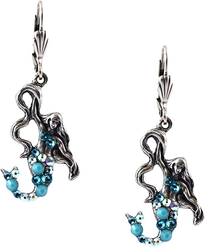 Tales of mermaids have been with us since earliest times. The mermaid on these earrings are encrusted with turquoise, light turquoise and crystal ab jewels.