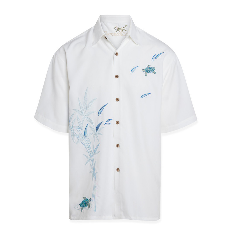 A classic original artwork of two turtles enjoying paradise among the bamboo leaves and stems. Tropical men's shirt with bamboo buttons and side vents.