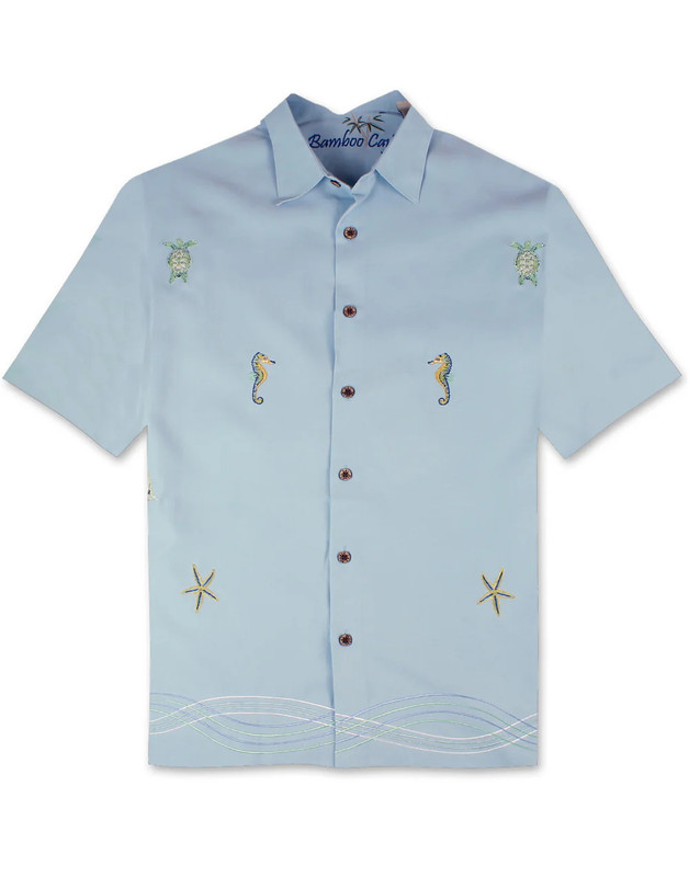 This Sporty Seahorse casual style men’s fine resort wear is a stylish design embroidered with intricate sea turtles, sea horses, and starfish over ocean waves for a coastal vibe. It is tailored to reflect the natural beauty of the islands. The fabric has a soft and silky texture, optimal color, good moisture absorption, and retains its high quality even after multiple washing’s. A comfortable and fashionable shirt which travels and wears well, especially in your own paradise! Bring the Island lifestyle into your daily life with Bamboo Cay fine resort wear men’s shirt.