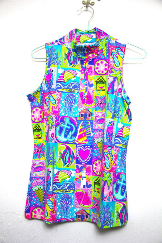 Show off in this Beach Time zip front high neck sleeveless top in a fun tropical print in neon colors. Be ready for a sporty sunny day with a top that goes with everything.