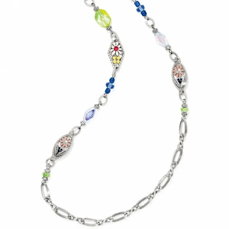This painted garden necklace is perfect-for-layering. It was inspired by an on-location painting class at a botanical garden. Brighton's designer framed tiny enameled blooms on a delicate chain, creating a feminine statement.