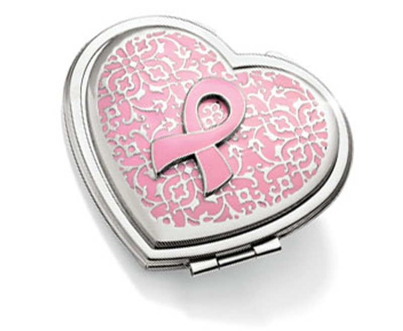 This Pop Heart Compact Travel Mirror is enameled in pink on the front with a breast cancer symbol.