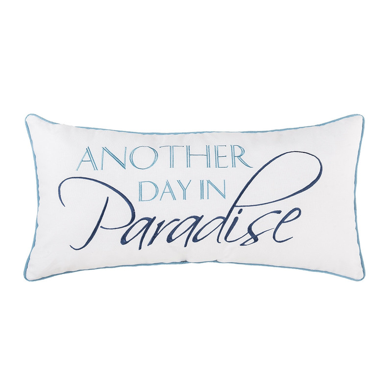 Unwind with the "Another Day in Paradise" accent pillow. Featuring an embroidered coastal sentiment in a calming blue colorway on a soothing white ground.