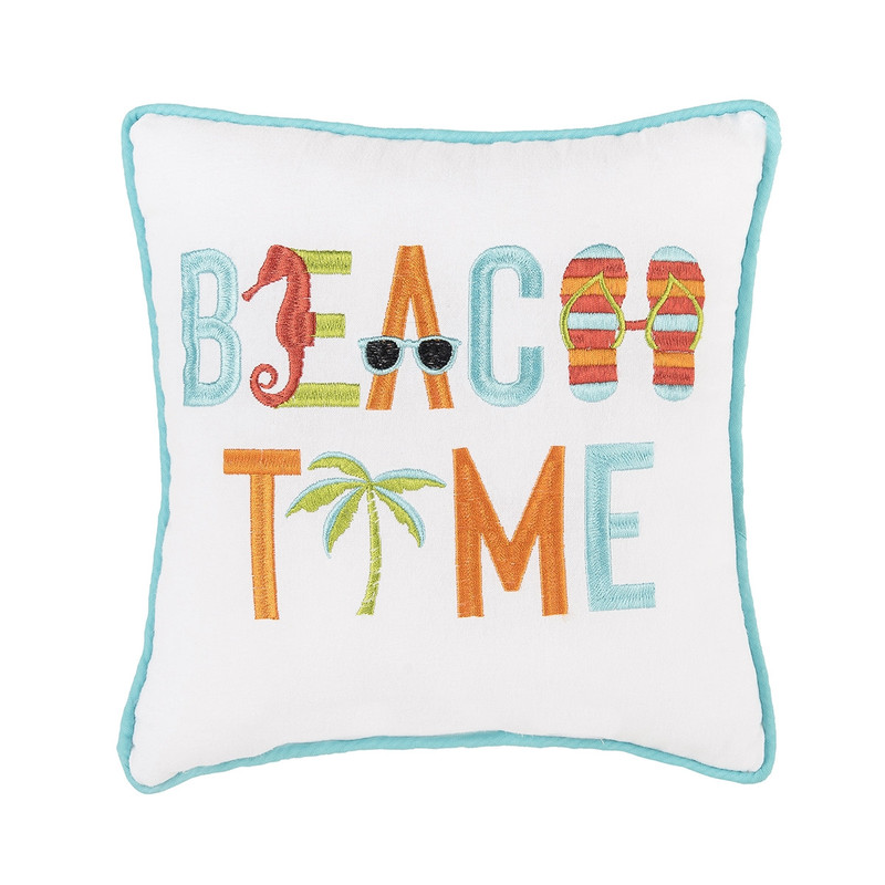 Bring the seaside to your home, regardless of where you live with this cotton pillow. Featuring a spunky tropical sentiment in orange, blue, and green colorways on a white ground.