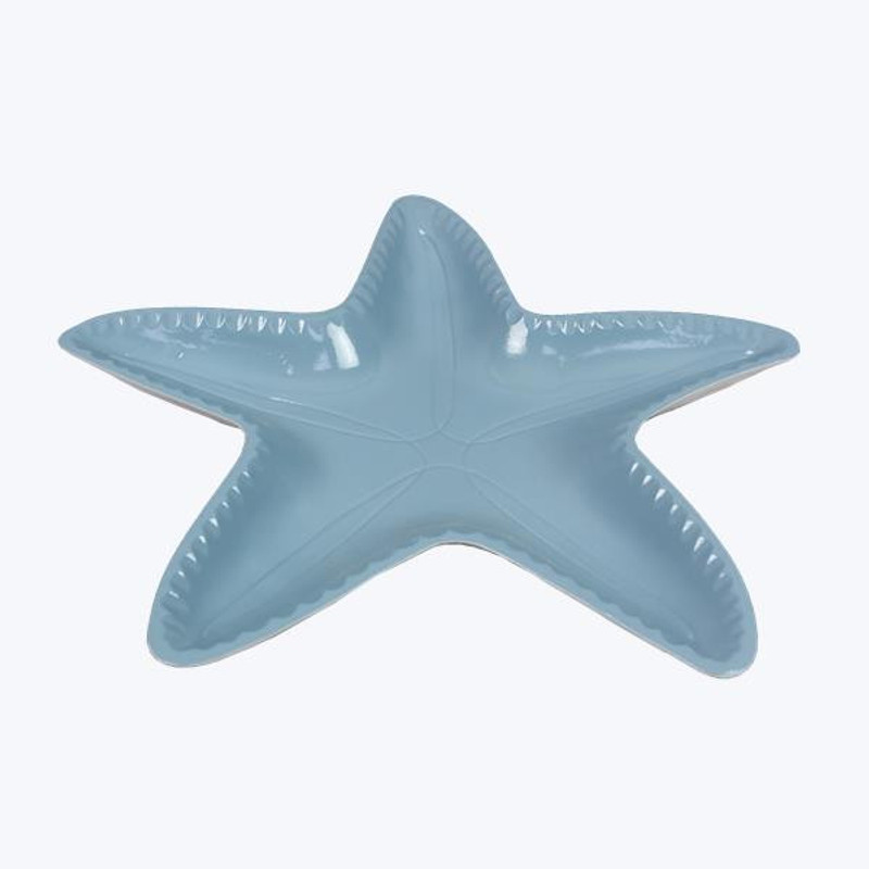 This dish shaped like a starfish is carved from wood, painted blue, and white underneath. Use it to decorate your beach home.