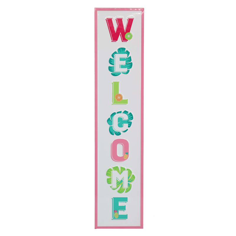A tall 36" welcome sign to hang at your door. Welcome guests with colorful tropical letters with palm leaves and flowers.