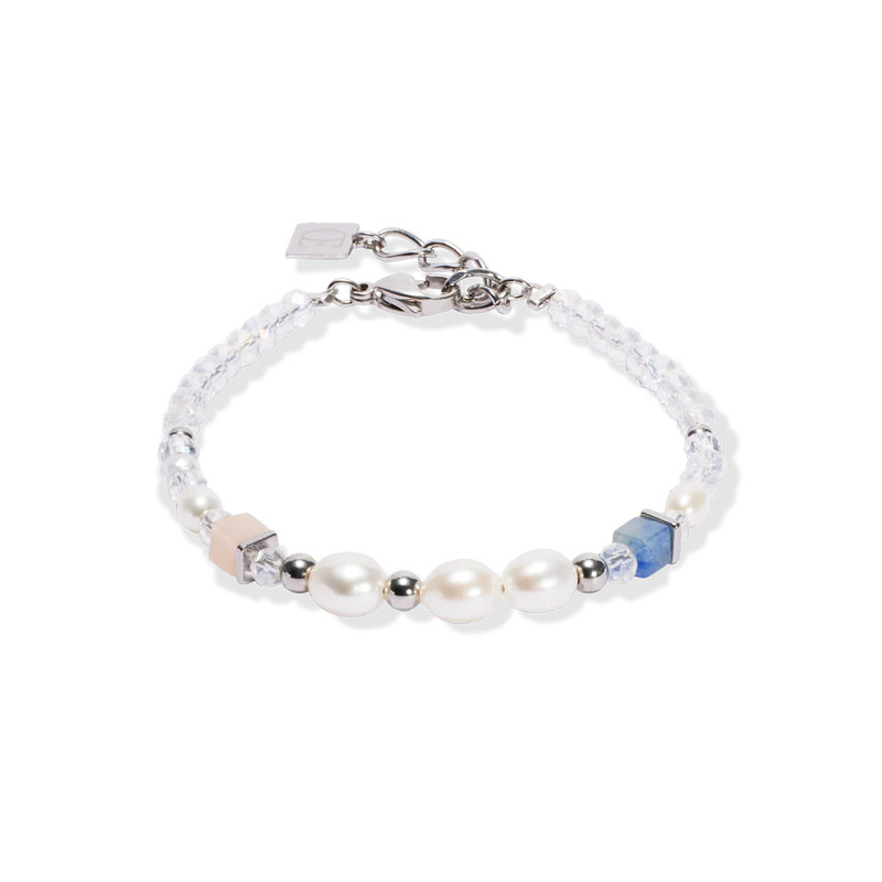 Airy, light and simply enchanting - This GeoCUBE® Coeur De Lion bracelet Cosmic Pearls soft silver bracelet brings pastel dreams to your wrist. Several shimmering freshwater pearls in the center are framed by delicate chalcedony, amazonite, blue aventurine and pink aventurine cubes. Silver-colored stainless steel adds a modern, fresh touch. Perfect for a playful look or as a subtle eye-catcher!