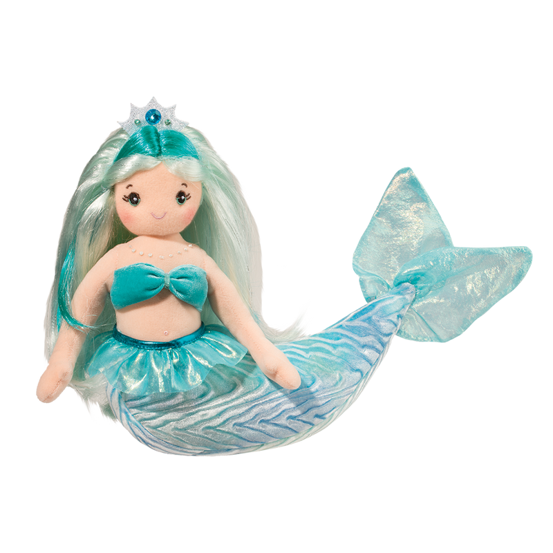 Ciara is whimsical and magical with a soft body and colorful turquoise and white extra long hair that can be brushed or styled with the included brush. She has a silver glittery crown atop her head signifies her royal status. She is positioned with her tale up and makes a great display in a beach house.