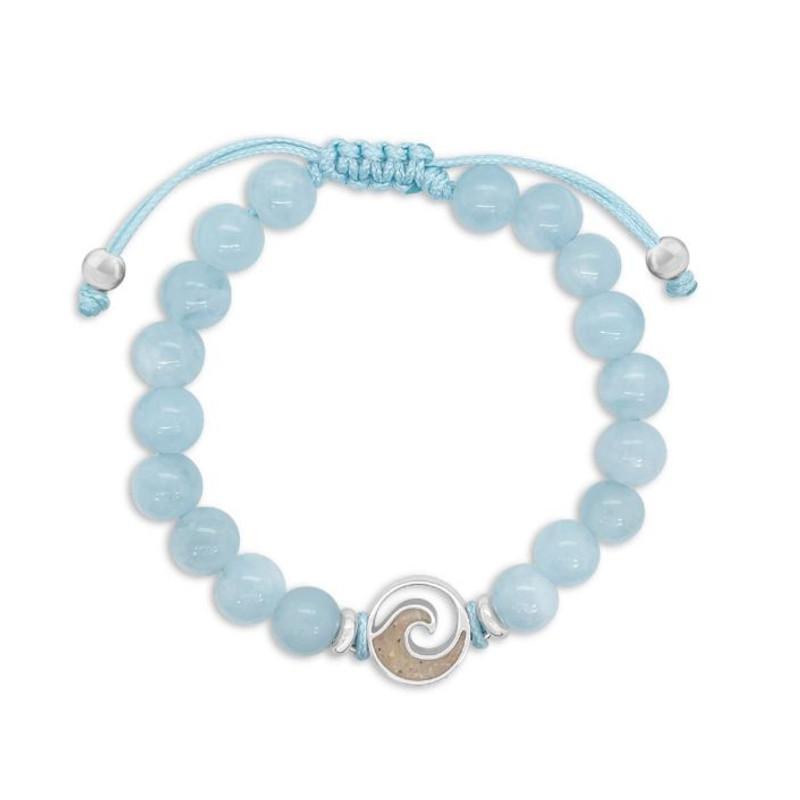 Crafted with genuine Aquamarine Beads and an adjustable corded band, this bracelet features a beach sand Wave, creating a unique reminder of a cherished memory or a future adventure.