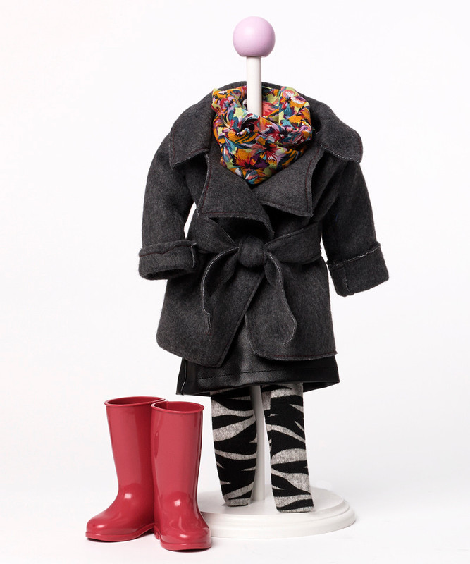 Your favorite friend doll can be ready for fall and cool weather with this gray coat with zebra stripe leggings, black tunic, scarf wrap, and red boots.