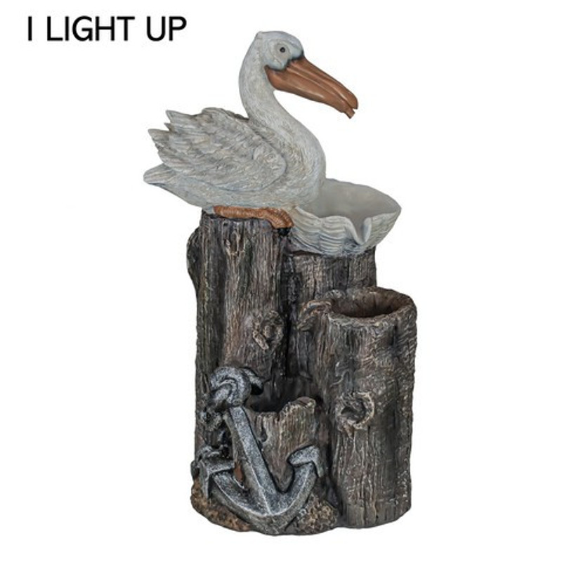 This White Pelican spouts water from it's mouth into a sea shell that over flows into a dock piling water fountain basin. An boat anchor decorates the base of the pilings. Decorate coastal home with this nautical indoor outdoor fountain that light ups.