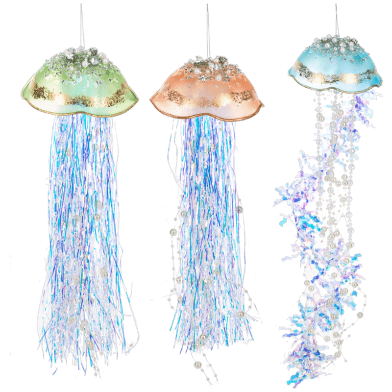 These Jellyfish Christmas Tree ornaments are accented with gold metallic, there tentacles are made of iridescent tinsels and streamers of pearls.