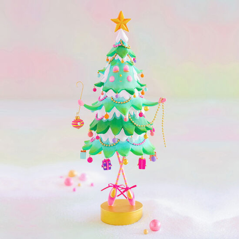 Pinsey on point has legs with ballet slippers, from Glitterville Christmas Tree ornaments s a pine tree decorated for Christmas with present hanging from the bottom.