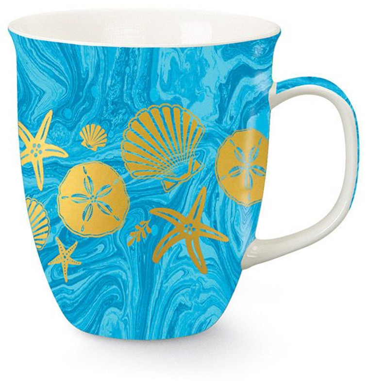 The Harbor Mug has become a Cape Shore staple. Beautiful full wrap design of gold sea shells on a marble print with a decorated handle. Classy and elegant shape.