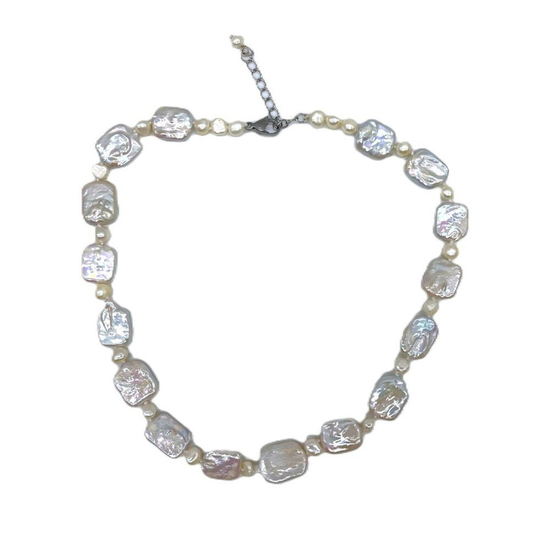 A single-strand necklace featuring lustrous white pearls in a sequence of large square-shaped pearls and small potato shaped pearl spacers.