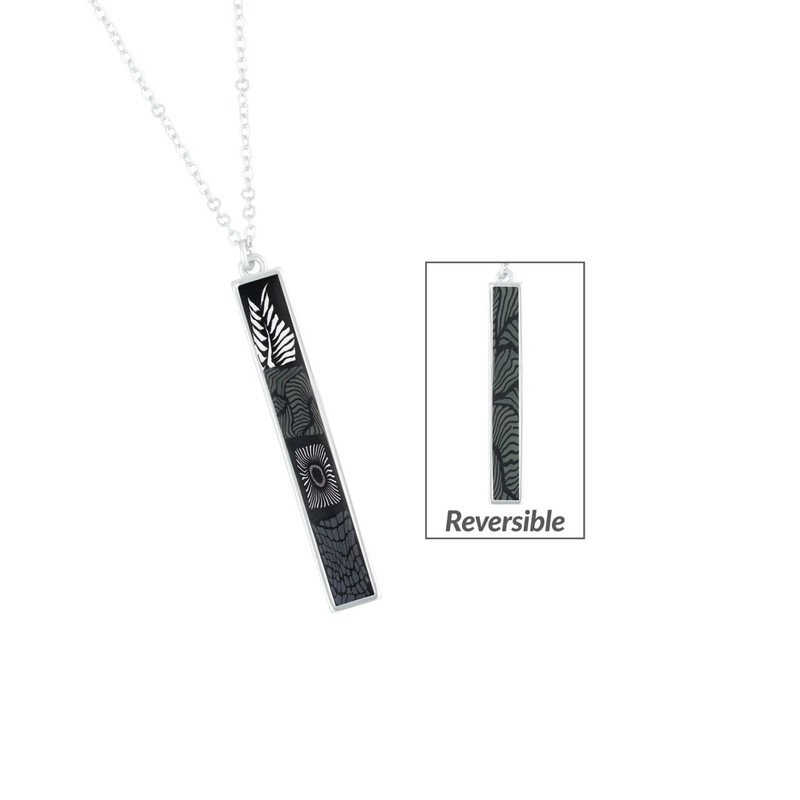 This modern reversible style is made with a double-sided long vertical bar inlaid with handcrafted clay inlays. The Midnight Palm Collection is an elegant and graceful suite of blacks, whites, and grays, combining to make a perfect and subtle staple color that complements almost any outfit.