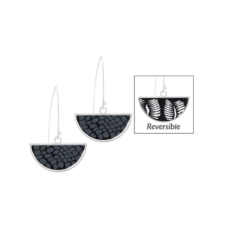 This modern reversible style is made with a double-sided half moon shaped bezel and inlaid with handcrafted clay inlays that easily slide on and off the fish-hook closure. The Midnight Palm Collection is an elegant and graceful suite of blacks, whites, and grays, combining to make a perfect and subtle staple color that complements almost any outfit.