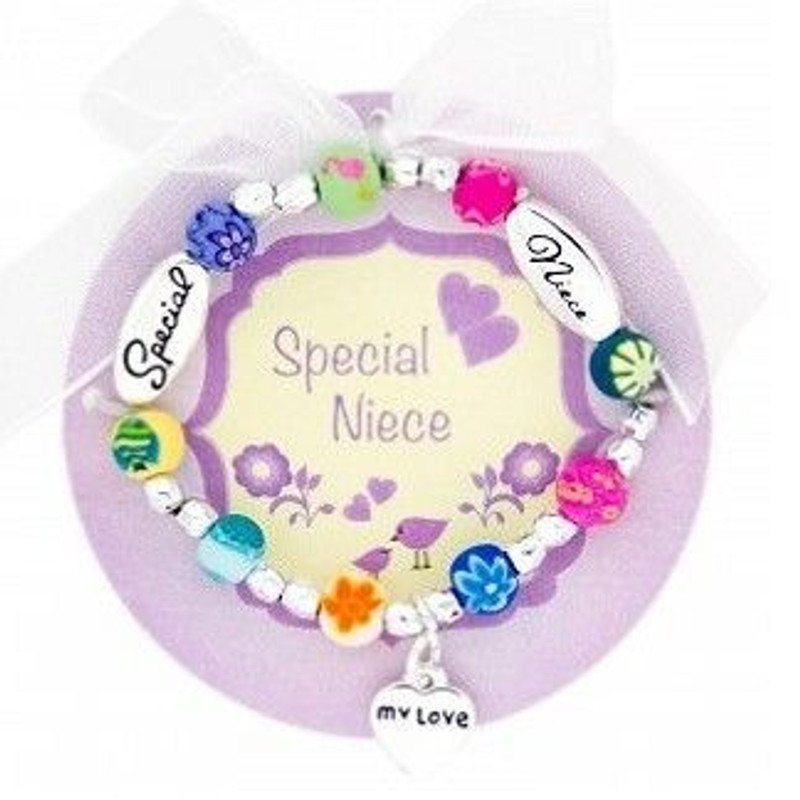 A colorful way to celebrate our love for your niece. This joyful bracelet includes handmade clay beads strung together with themed charms, that serve as a reminder of family love.