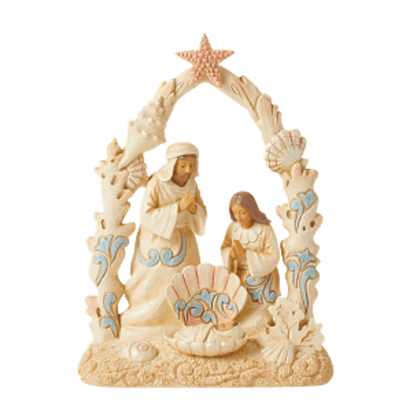 Remember the true reason for the season with this enchanting nativity scene by Jim Shore. Inspired by the coast, the holy family rests under a creche constructed from seashells. Baby Jesus sleeps peacefully inside an open clam shell upon the sand. Jim Shore's unmistakable style evokes a sense of nostalgia with traditional themes quilt pattern and motifs inspired by American and European folk art.