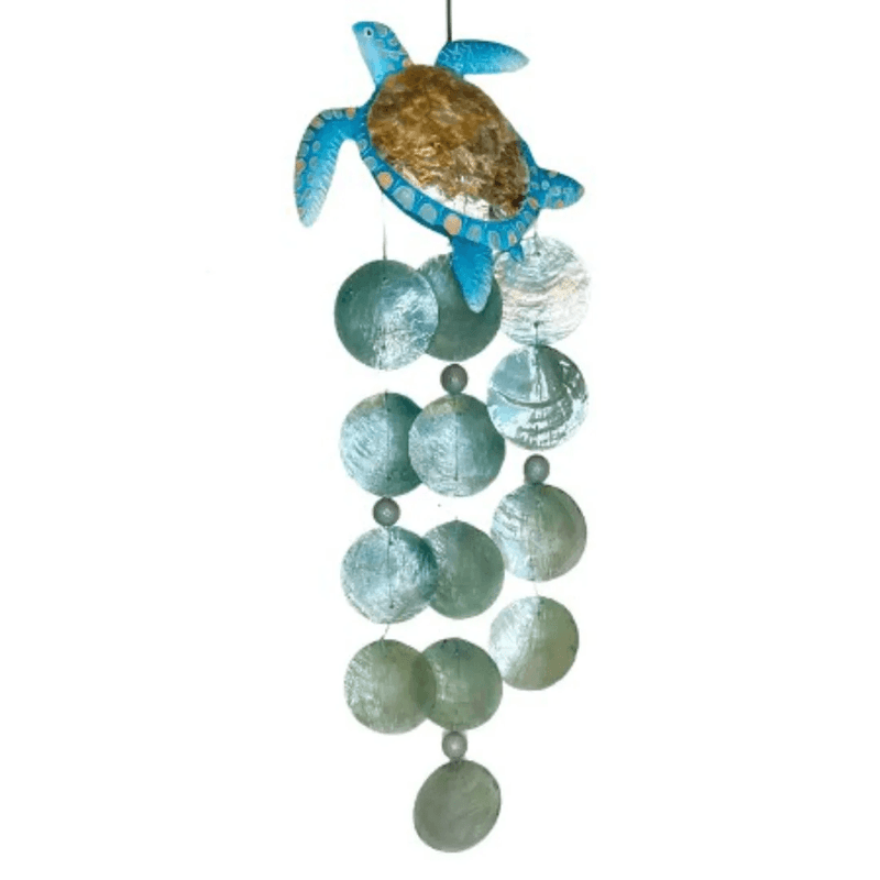 The handcrafted cut metal turtle has capiz shells on his shell and round capiz shell dangles for a wind chime.