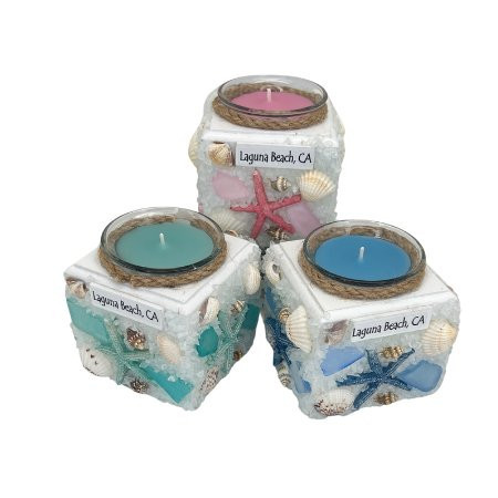 Handcrafted candle holder decorated with seaglass, seashells, and starfish. The glass votive has a colored candle and rope accent.