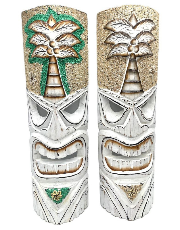 This white wood Tiki pole mask is heavily carved with a A Palm Tree theme and accented with beach sand and cowrie shells. Add a little fun to you indoor or outdoor party space. Hang these Tiki masks on a wall or place on your Tiki bar counter!