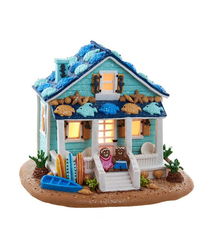 This glittered gingerbread beach house is festively decorated with a beach ready gingerbread couple, assorted fish and seashell roof, and a chimney decorated with an anchor. Its base is created to resemble sand with plants, surf boards and a boat. When switched on, this stunning gingerbread beach house is illuminated. A great coastal Christmas decoration!