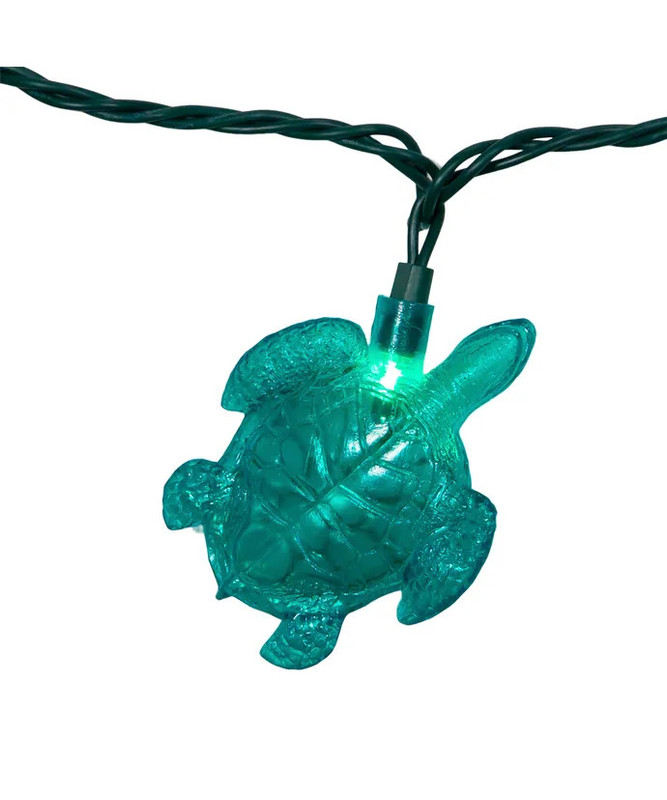 This UL 10-Light Sea Turtle Light Set is a fun, unique way to add to the lighting of any theme party décor or on a sea themes Christmas tree! Each of the 10 lights in this novelty light set resembles a green turtle with gold accents on its back. Each of the 10 clear incandescent lights have a turtle light cover and can be used both indoors and outdoors.