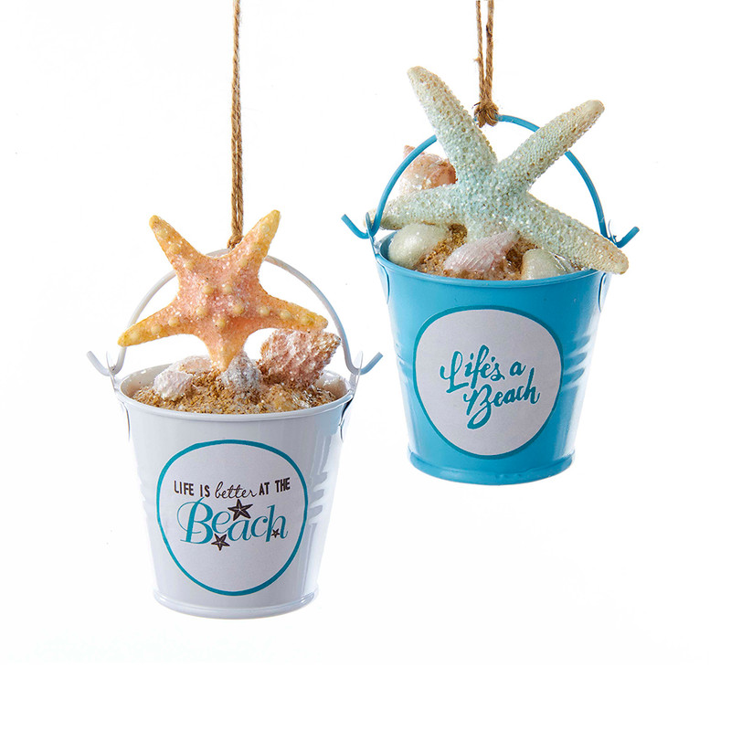 A tin sand pail bucket filled with shells and a starfish Christmas Ornament