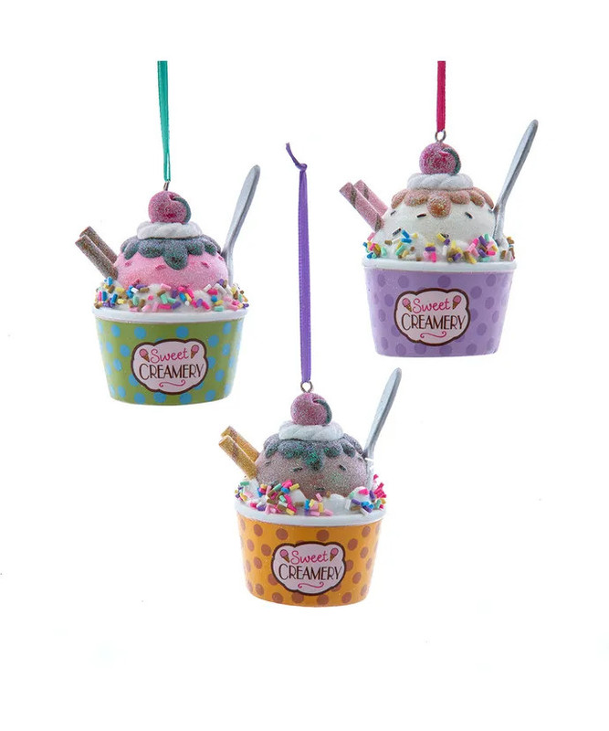 Delight in the sweet charm of Kurt Adler's Pastel Ice Cream Cup Ornaments! This whimsical assortment features three ornaments, each designed to resemble adorable ice cream Sundae cups in soft pastel colors. With intricate details and playful designs, these ornaments capture the joy of your favorite frozen treats, adding a touch of whimsy to your holiday decor. Crafted from high-quality materials, these lightweight ornaments are perfect for hanging on your Christmas tree, adorning garlands, or using as playful accents throughout your home. Their pastel hues and charming shapes make them ideal for complementing any holiday theme, while bringing a refreshing pop of color to your festive celebrations.