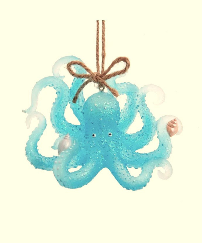 This transparent sea blue octopus ornament from Kurt Adler is a unique addition to your holiday décor or Christmas tree. It features a transparent blue octopus with glitter and seashell accents.
