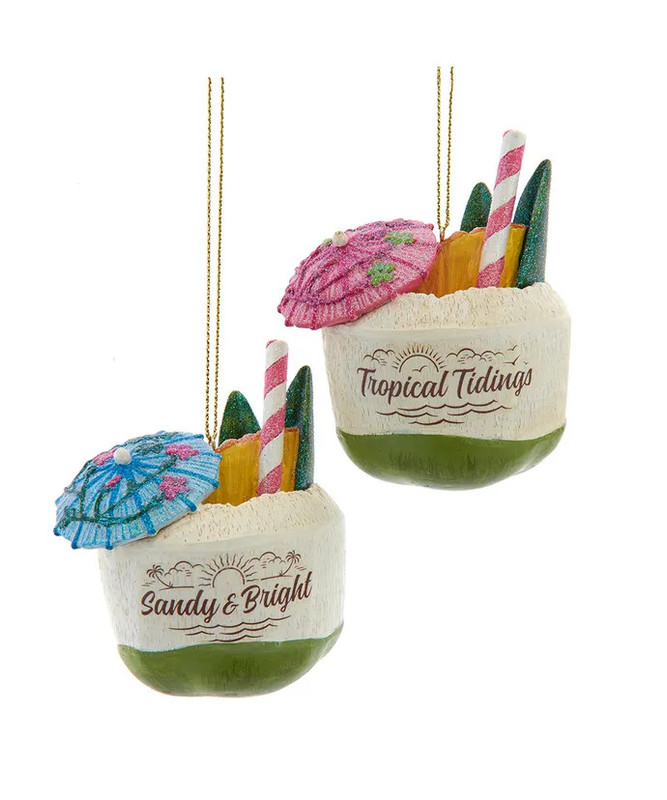 Bring a tropical vibe to your holiday décor with Kurt Adler's Coconut Drink Ornaments. These fun and playful ornaments feature two unique designs of colorful coconut drinks, complete with tiny umbrellas, fruit garnishes, and festive straws, capturing the laid-back, beachy feel of a tropical vacation. Perfect for adding a splash of summer warmth to your Christmas tree or any celebration, these ornaments are a delightful way to mix holiday cheer with a touch of the tropics. Whether you're reminiscing about a beach getaway or just love island-inspired décor, these ornaments will add a refreshing twist to your festive season!