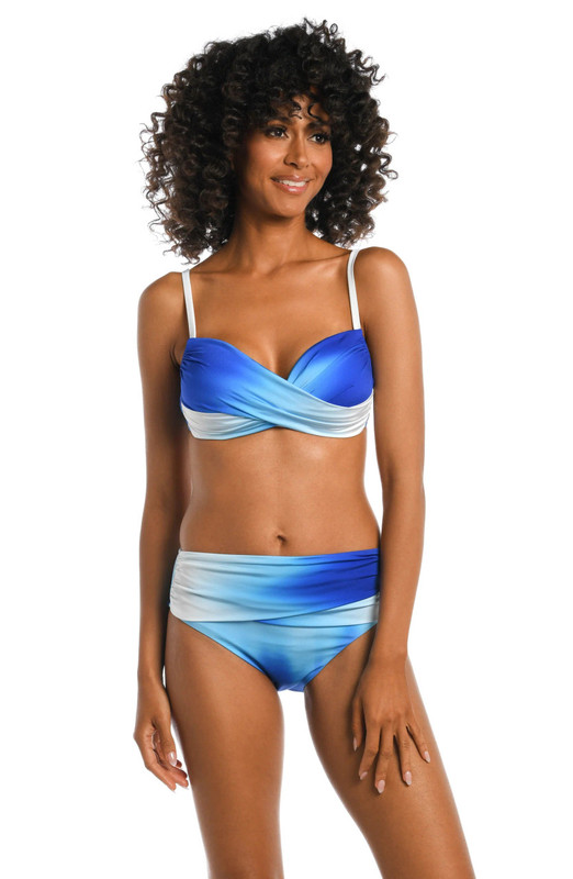 Gorgeous ombre shades of blue fade into crisp white on this bikini top, adding movement and depth to the design. The sweetheart neckline with a wrap-style front accentuates the bustline while still providing just-right coverage. Adjustable over-the-shoulder straps and built-in cups give you the perfect amount of lift.