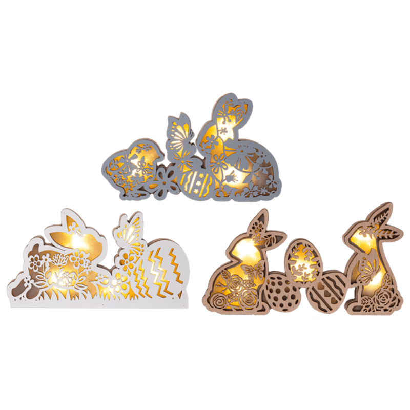 Add a little light to your Easter decorations with these pretty laser cut figurines with Easter Eggs, Bunnies, and Chicks. Three colors to choose from.