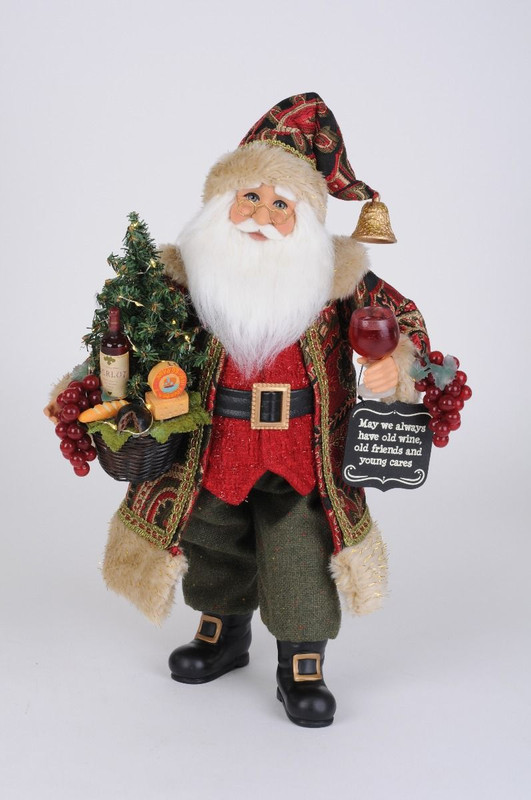 - Detailed accessories : Holding a basket with a Christmas tree that lights up with grapes, cheeses, and a bottle of wine in it. In his other hand he has a glass of red wine, grapes, and a sign that says "May we always have old wine, old friends and young cares"