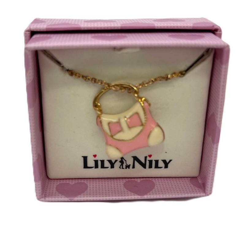This charming necklace for girls features a hand-painted enamel purse with gold handle on a gold chain.