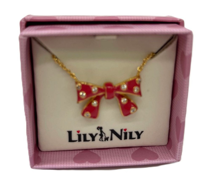 This charming necklace for girls features a hand-painted enamel bow with clear CZs on a gold chain.