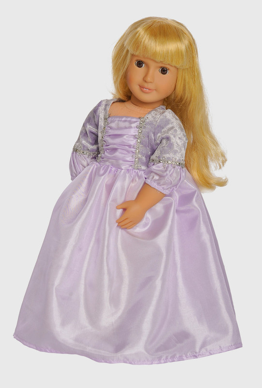 This beautiful Rapunzel style gown in lavender purple with sparkle fabric sleeves and silver beaded trim will make your dolly feel like a princess.