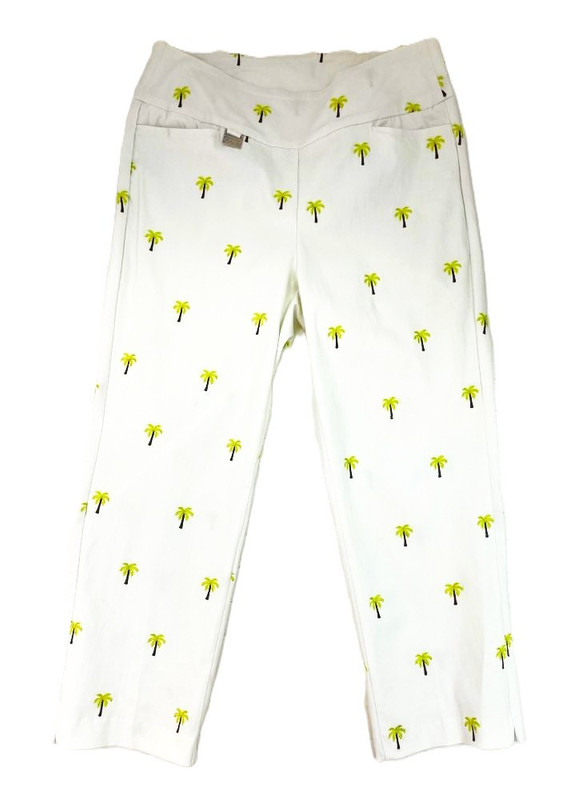 Be tropical in these comfortable stretch pull on capr pants from Lulu-B embroidered with a palm tree design.