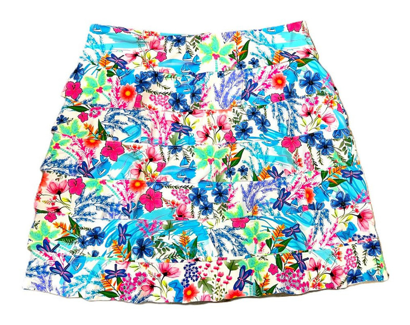 This Cha Cha ruffles skort adds a little flare to your sport moves. Stand out with this fun neon print of flowers and sailboats. A tropical skort.