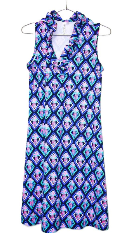Add a little ruffle to your neckline with this be noticed tropical dress in a neon pink and navy blue pineapples print fabric that is cool and comfortable to wear.