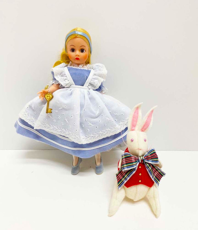 This was a special edition of Alice In Wonderland doll was produced for the 1991 Walt Disney Doll Showcase. She is dressed in a blue velvet dress trimmed with white braiding and worn with a white eyelet pinafore. She wears a blue ribbon headband in her long full curly hair, has blue velvet high heel shoes, white shimmer long stockings, and blue eye shadow on her eyelids. She comes with a 5" felt White Stuffed Rabbit in a red vest with a big plaid bow tie.