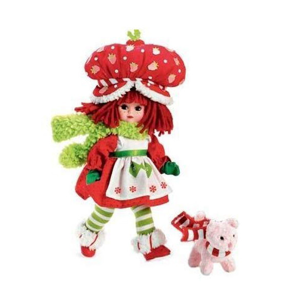 This Strawberry Shortcake Madame Alexander Doll is dressed in her official Strawberryland Outfit in red with a white apron with prints of snowflakes. She has a large puff red hat with a strawberry print and white faux fur trim. She has green mittens, a lime green fluffy scarf, lime green striped leotards, and white faux fur trimmed red boots. She comes with her plush Custard pink cat that has a red and white striped scarf.