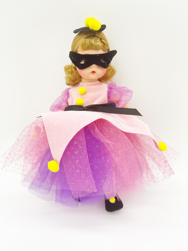 The Columbine Alexander doll is the ballerina from the Nutcracker she is dressed in a long pink and purple sparkle tutu with yellow pom-pom accents, she has a black hat and face mask.