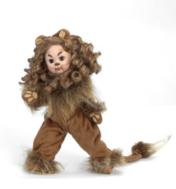 This Madame Alexander Cowardly Lion Wizard Of Oz doll wears a tan felt suit with ears, his curly mane surrounds his face painted with lion features.