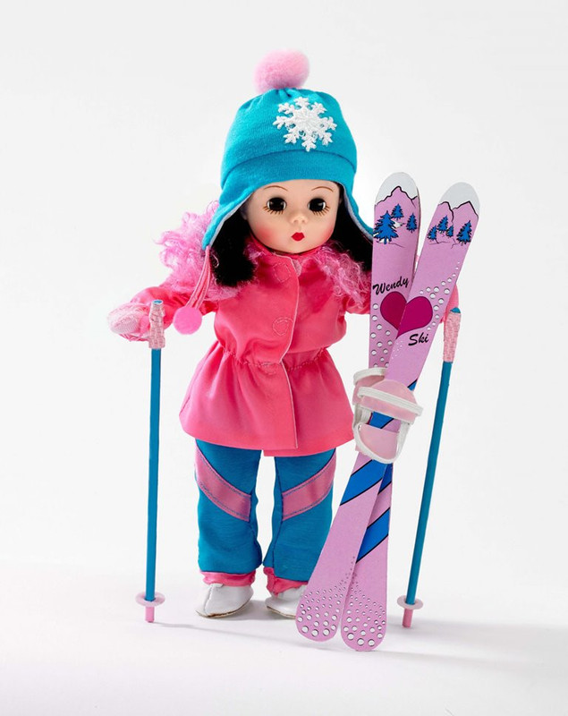 This Downhill Skiing Wendy Madame Alexander doll loves downhill skiing and comes dressed in her pink winter jacket with blue snow pants, and a matching knit cap with a pink pom pom on top. She comes with her pretty pink set of skis and ski poles.
